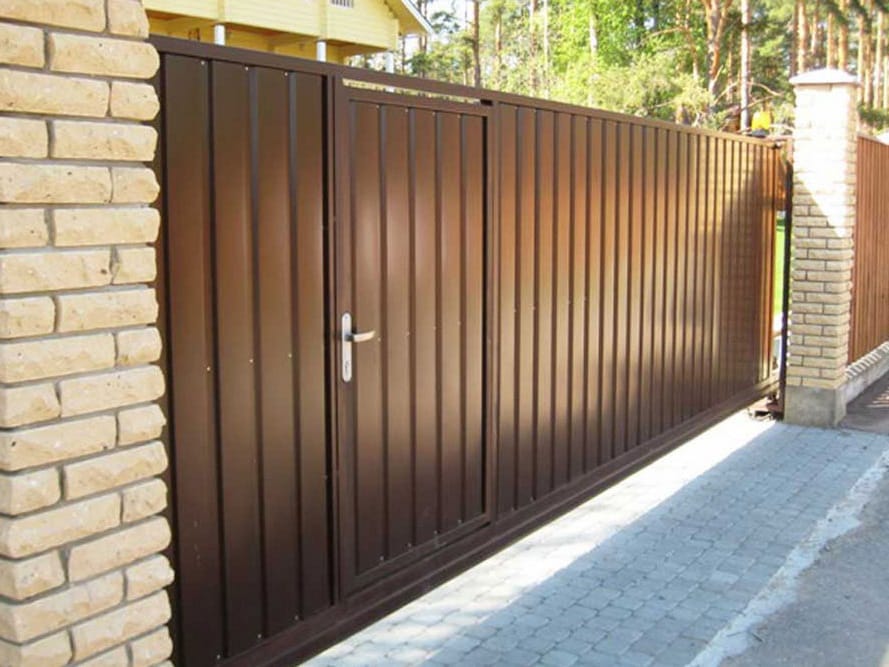 Откатные ворота из профнастила с встроенной калиткой и автоматикой